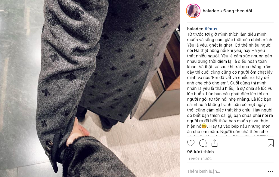 Cụ thể, cô nàng viết: "Từ trước tới giờ mình thích làm điều mình muốn và sống cảm giác thật của chính mình. Yêu là yêu, ghét là ghét. Có thể nhiều người nói Hà thật nông nổi khi yêu, hay Hà yêu thật nhiều người. Yêu là cảm xúc nhưng gặp nhau đúng thời điểm lại là điều hoàn toàn khác. Và thật sự sau khi trải qua thăng trầm đấy thì cuối cùng cũng có người ôm chặt lấy mình và nói: 'Em đã vất vả nhiều rồi hãy để anh che chở cho em'. Cuối cùng thì mình nhận ra yêu là thấu hiểu, là sự chia sẻ lúc vui lúc buồn. Lúc bạn cáu phát điên lên thì có người ngồi từ tốn nói nhẹ nhàng.
