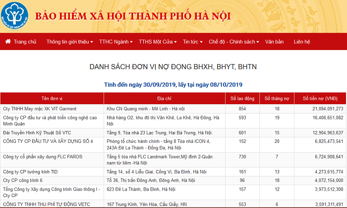 BHXH thành phố Hà Nội đã nhiều lần công khai danh sách các đơn vị nợ BHXH kéo dài với số nợ lớn. Đây đều là những doanh nghiệp có xu hướng gia tăng nợ theo thời gian do phát sinh lãi chậm đóng.