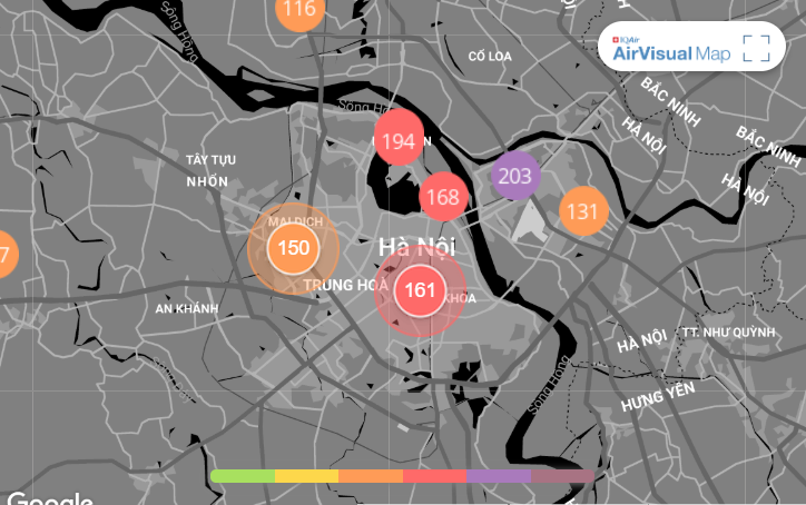 Ở nhiều điểm đo khác, chỉ số AQI cũng ở ngưỡng “xấu” như: Hàng Đậu (168), khu vực Tây Hồ (198), Tân Mai (158), Phạm Văn Đồng (166). Tại thời điểm này, chỉ số AQI tại khu vực Nguyễn Văn Cừ đã tăng lên tới 203 ngưỡng cảnh báo "màu tím".
