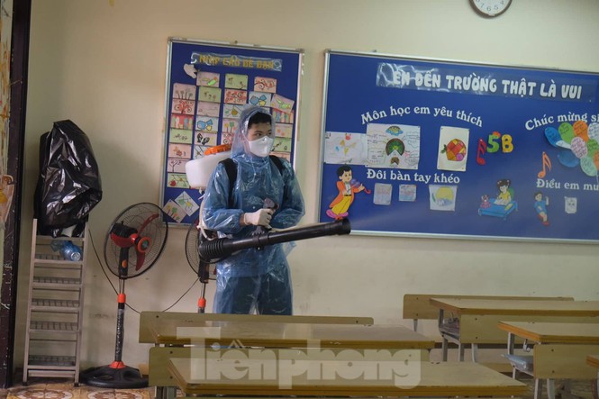 Trong sáng 14/2, nhiều học trên địa bàn thành phố Hà Nội bắt đầu tiến hành phun thuốc khử khuẩn lần thứ 3.