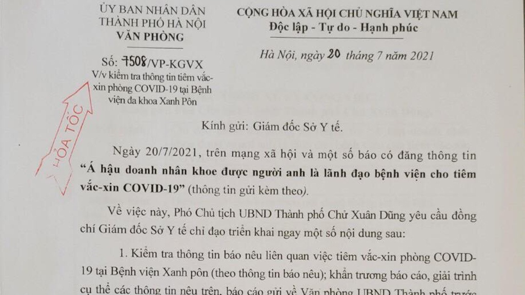 UBND TP Hà Nội vừa có văn bản hỏa tốc gửi sở Y tế Hà Nội về việc kiểm tra thông tin tiêm vắc-xin phòng COVID-19 tại bệnh viện Đa khoa Xanh Pôn.