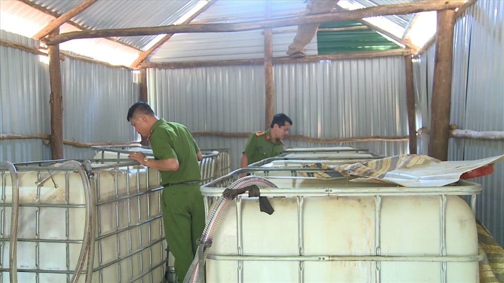 Qua kiểm tra, công an phát hiện cơ sở này đang vận hành lò đốt để chưng cất 5.000 lít dầu nhớt thải và 750 lít dầu nhớt thành phẩm chuẩn bị xuất bán.