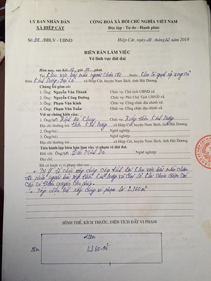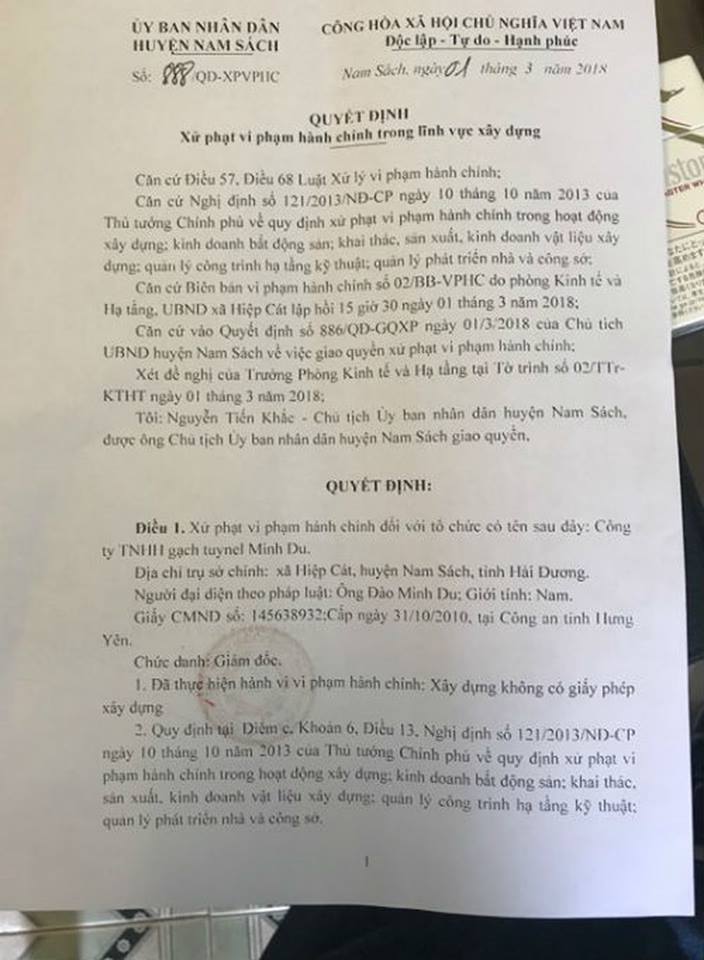 Sau đó, vào ngày 1/3/2018, UBND huyện Nam Sách (tỉnh Hải Dương) ra Quyết định số 888/QĐ-XPVPHC xử phạt vi phạm trong lĩnh vực xây dựng đối với Công ty TNHH gạch tuynel Minh Du có địa chỉ tại xã Hiệp Cát (Nam Sách, Hải Dương), người đại diện theo pháp luật là ông Đào Minh Du.