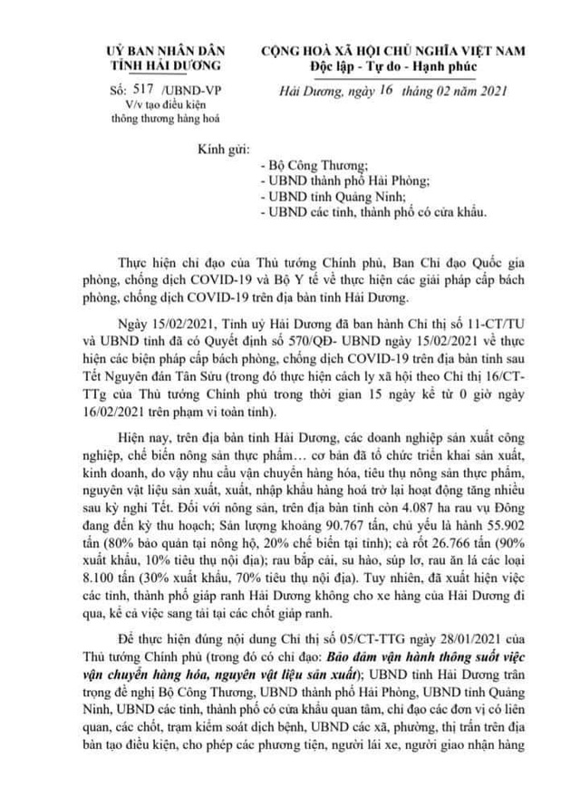Chiều 16/2, Chủ tịch UBND tỉnh Hải Dương Nguyễn Dương Thái đã văn bản gửi bộ Công Thương, UBND TP.Hải Phòng, tỉnh Quảng Ninh và các địa phương có cửa khẩu để đề nghị quan tâm, tạo điều kiện cho phép các phương tiện, tài xế và người giao nhận hàng hóa của các doanh nghiệp trên địa bàn tỉnh được ra, vào các địa phương nhằm đảm bảo lưu thông hàng hóa, kịp thời tiêu thụ cũng như thông quan hàng hóa theo đúng kế hoạch.