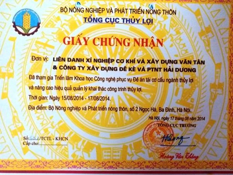 Tại Triển lãm giới thiệu sản phẩm công nghệ tiên tiến phục vụ tái cơ cấu ngành Nông nghiệp và Phát triển nông thôn diễn ra từ ngày 15 – 17/8/2014 tại Hà Nội, “Sản phẩm Kênh mương bê tông đúc sẵn thành mỏng” của Xí nghiệp cơ khí và xây dựng Văn Tân có thiết kế kiểu dáng tương tự cũng đã được trưng bày, đồng thời được Thứ trưởng Bộ Nông nghiệp và Phát triển nông thôn Hoàng Văn Thắng đánh giá cao về sản phẩm và cấp giấy chứng nhận sau đó.