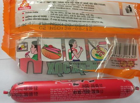 Về mặt cảm quan, sờ vào xúc xích có cảm giác bên trong ứ nước gây căng phồng. Đây là loại sản phẩm 40 g, gói 4 cây có tổng trọng lượng 160 gr, bao bì ghi hướng dẫn bảo quản ở nhiệt độ thường, tránh ánh nắng trực tiếp. Trên bao bì ghi ngày sản xuất 28/5/2012, hạn sử dụng đến 28/8/2012.