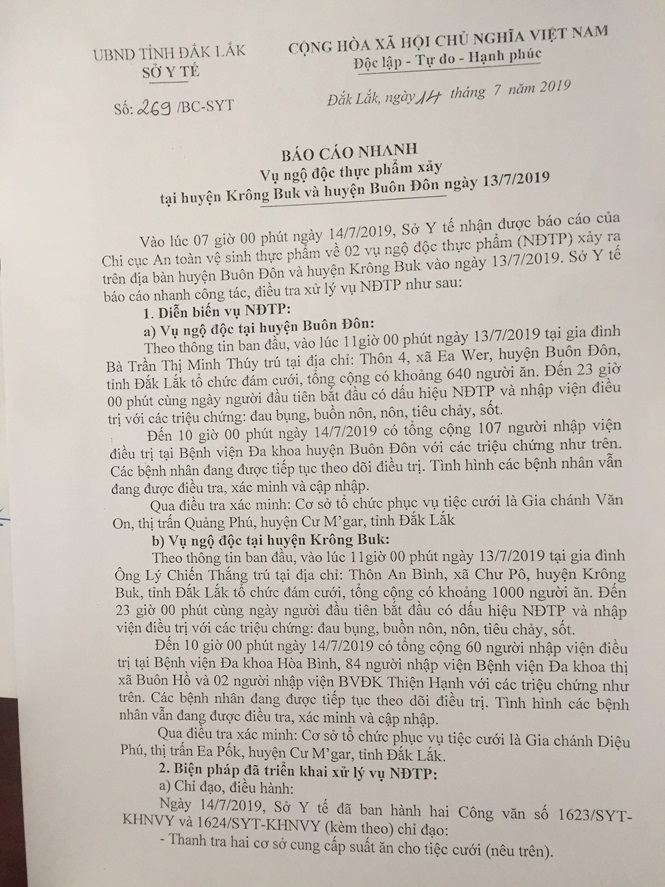 Báo cáo của Sở Y tế nêu, vào lúc 11 giờ ngày 13/7 tại hai huyện Buôn Đôn và Krông Búk có tổ chức 2 đám cưới, khiến 253 người nhập viện, nghi bị ngộ độc thực phẩm.