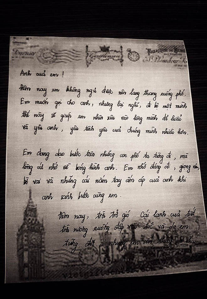 Đêm nay em không ngủ được nên lang thang xuống phố. Em muốn gọi cho anh, nhưng lại nghĩ, đi bộ một mình thế này sẽ giúp em nhìn sâu vào lòng mình để hiểu và yêu anh, yêu tình yêu của chúng mình nhiều hơn.