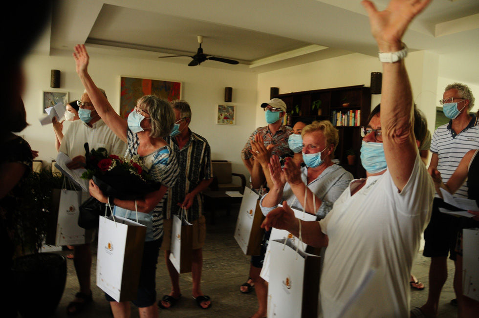 Khoảng 11h trưa cùng ngày, 39 du khách nước ngoài tập trung trước sảnh resort Hội An Coco River. Tất cả đều tỏ ra vui mừng, hạnh phúc khi biết rằng bản thân có kết quả âm tính với COVID-19.