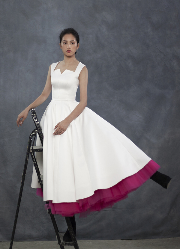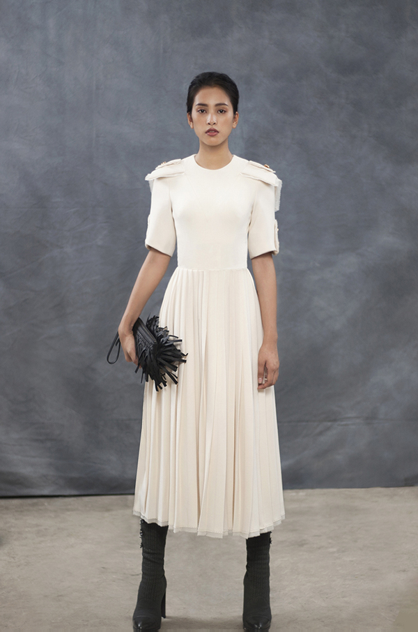 Với đầm xòe màu trắng, Tiểu Vy toát lên vẻ trang nhã.