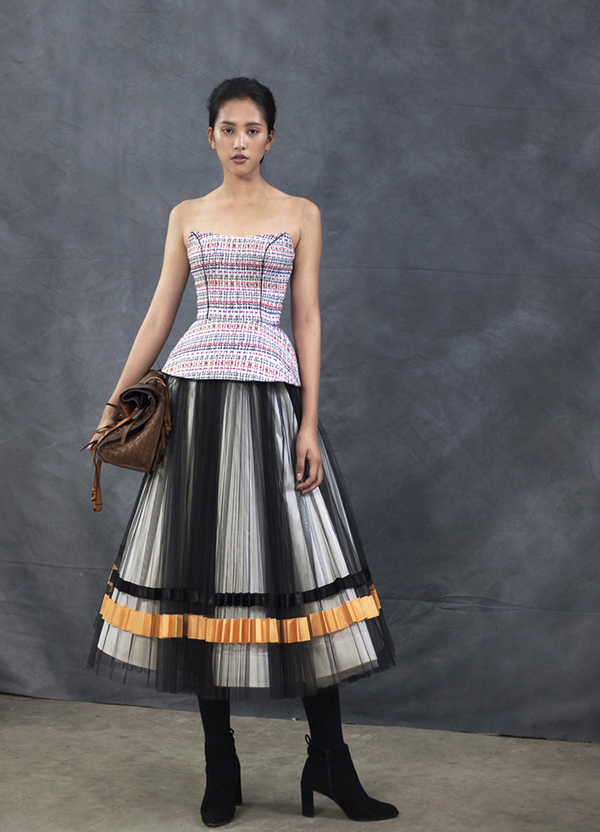 Áo quây ngực vải tweed đi kèm chân váy voan xếp ly, kết hợp bốt cổ ngắn giúp cô trở nên cá tính