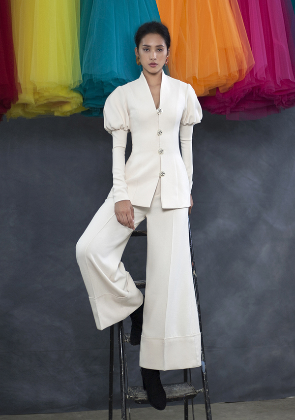Không khí thời trang những năm 1970,1980 được gợi lại với bộ đồ gồm áo tay bồng và quần ống loe.