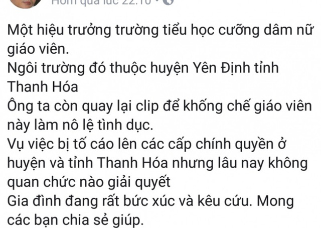 Những ngày gần đây thông tin về việc giáo viên tố hiệu trưởng cưỡng dâm trong nhiều năm được lan truyền trên mạng xã hội khiến cộng đồng mạng hết sức quan tâm. Trước thông tin trên, sáng ngày 6/1, nguồn tin từ Sở Nội vụ tỉnh Thanh Hóa cho biết cơ quan này đã vào cuộc xác minh đơn khiếu nại của bà N.T.Q, nguyên phó hiệu trưởng trường tiểu học Y.B (huyện Yên Định), tố cáo ông T.H.T, nguyên hiệu trưởng trường tiểu học Y.B, có hành vi cưỡng dâm bà và đã báo cáo kết quả kiểm tra cho chủ tịch UBND tỉnh Thanh Hóa.