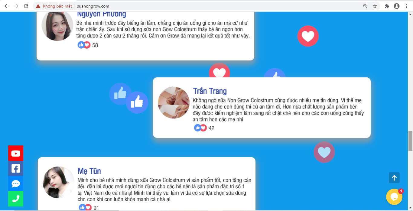 Tương tự như chị N., một khách hàng khác cũng cho biết: “Trên website suanongrow.com, sữa non Grow Colostrum quảng cáo công dụng như chống vi khuẩn, kích thích ăn ngon… nên tôi đã mua cho bé 2 tuổi nhà tôi sử dụng với mong muốn bé phát triển khỏe mạnh, nhưng qua quá trình sử dụng, bé nhà tôi vẫn ốm vặt thường xuyên và biếng ăn hơn. Sản phẩm này hình như không có tác dụng nhiều thì phải”.