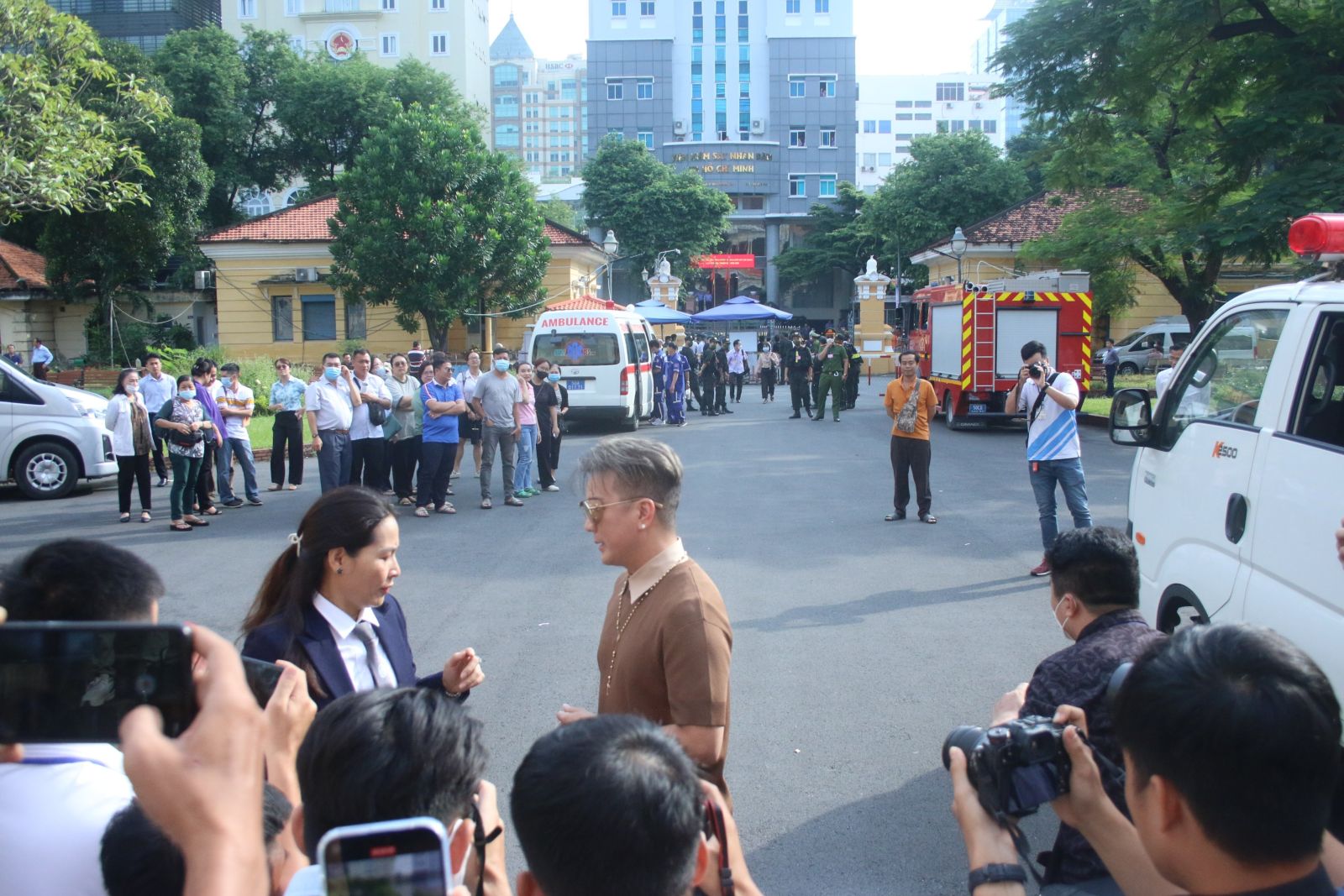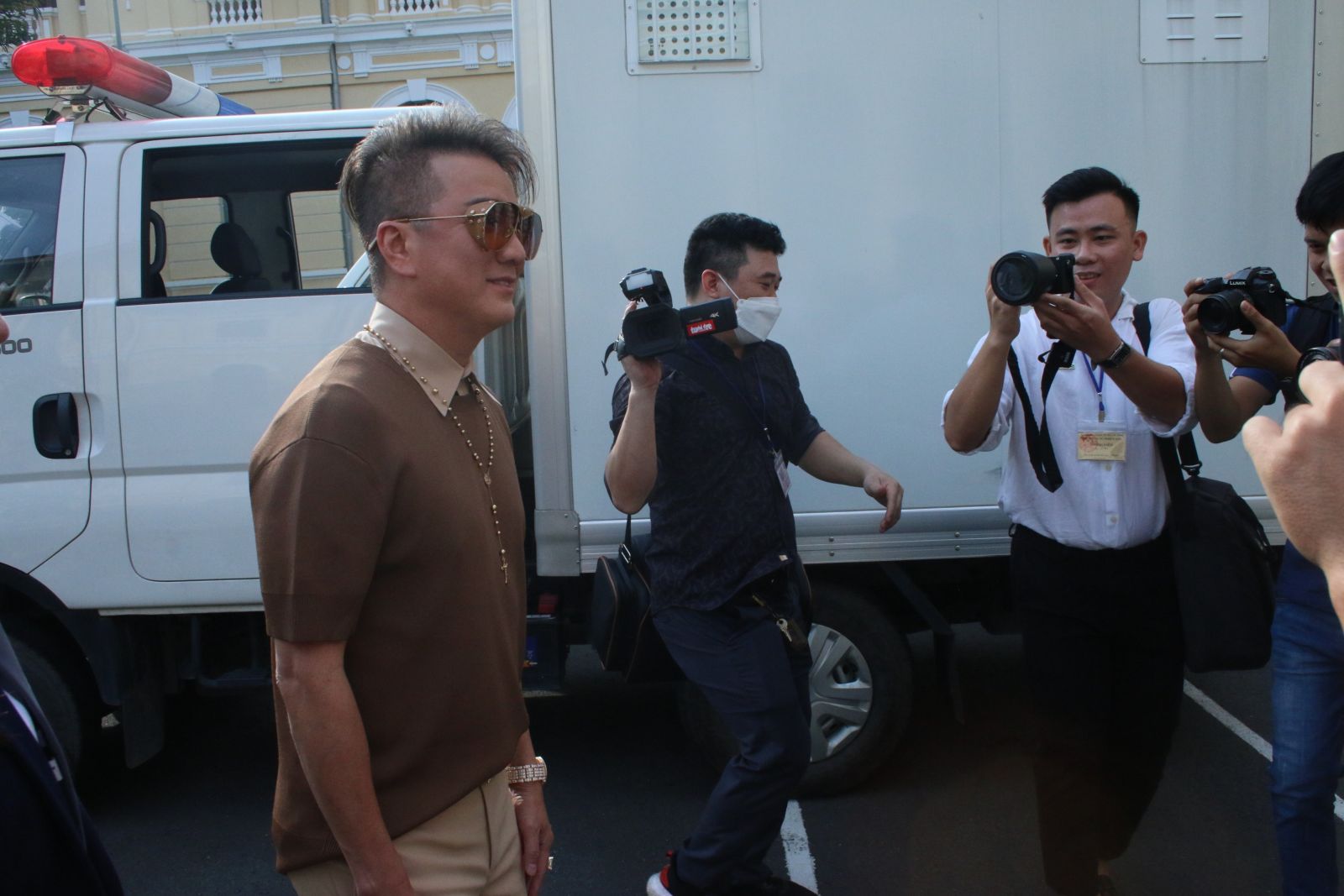 Bị cáo Nguyễn Phương Hằng được áp giải đến tòa từ sớm, trong khi Đàm Vĩnh Hưng, Vy Oanh gần 8h mới có mặt. Người dân hiếu kỳ cũng tụ tập tại đoạn đường trước tòa án.