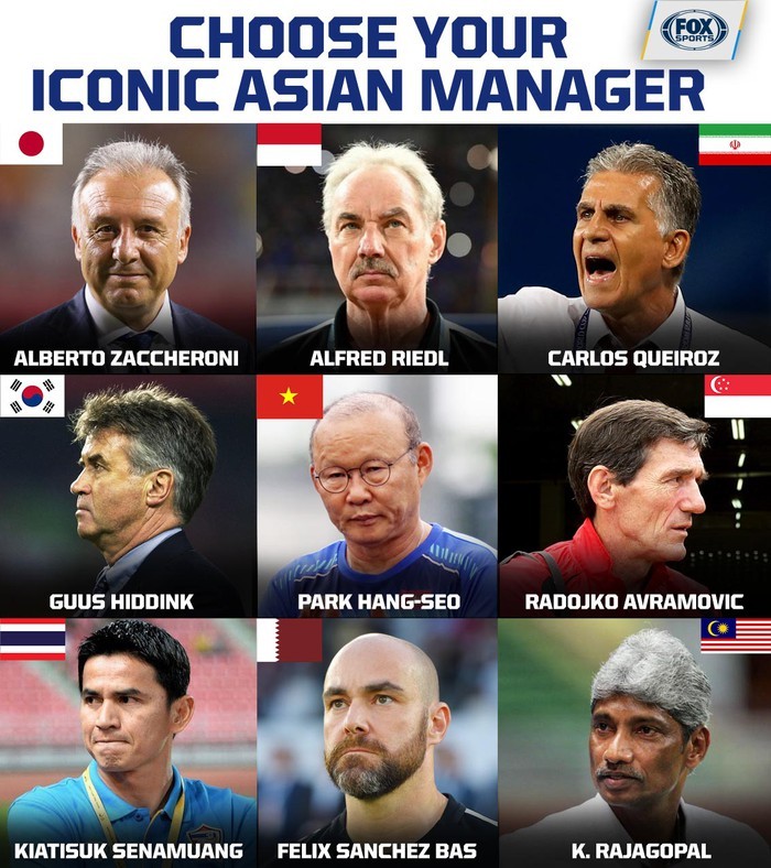 Sau khi tổ chức bầu chọn các vị trí thủ môn, hậu vệ, tiền vệ và tiền đạo xuất sắc nhất châu Á, mới đây, tờ Fox Sport Asia cũng công bố danh sách 9 HLV xuất sắc nhất trong lịch sử bóng đá châu Á.