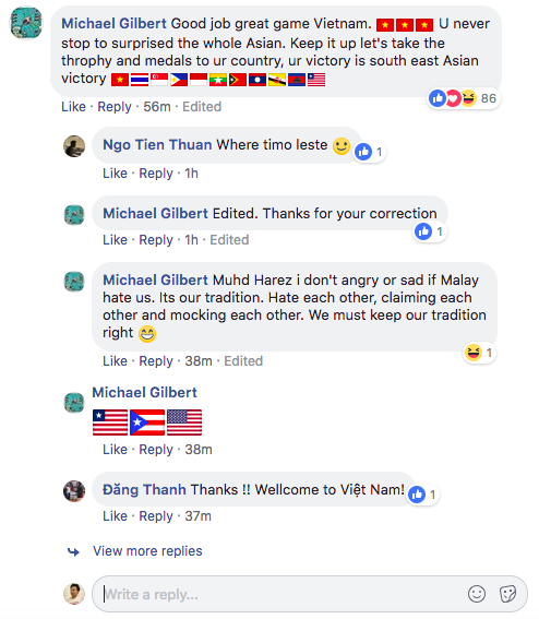 CĐV Afdhal cũng viết: "Chúng tôi tự hào về thắng lợi này. Hy vọng Việt Nam sẽ vô địch để giúp các đội bóng ở Đông Nam Á nhìn lại bản thân và phấn đấu hơn nữa". Fakhri Ahmad chung nhận xét: "Hãy vô địch giải này nhé Việt Nam. Hãy mang HC vàng bóng đá nam về cho Đông Nam Á. Chúng tôi đều ủng hộ các bạn. Từ Malaysia".