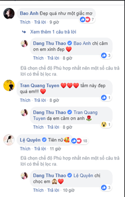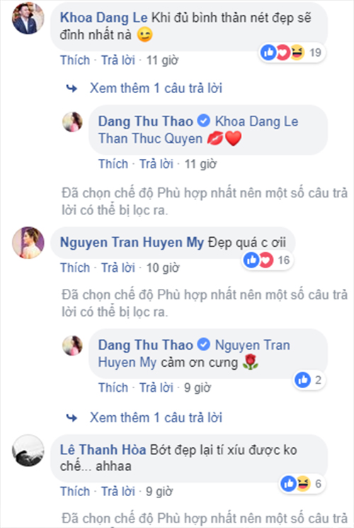 Cùng với hình ảnh mới, Đặng Thu Thảo viết: "Khi còn trẻ ta là người quan tâm đến quá nhiều thứ trong cuộc sống, quan trọng hoá ánh nhìn từ người khác. Thời gian qua đi, ta nhận ra rằng hạnh phúc lớn nhất mà ta tìm thấy đó là dành sự quan tâm của mình cho một vài điều thực sự đáng trong cuộc đời sẽ khiến cuộc sống này nhẹ nhàng hơn nhiều. Yên tựa mây trời hạnh phúc sẽ nở hoa".