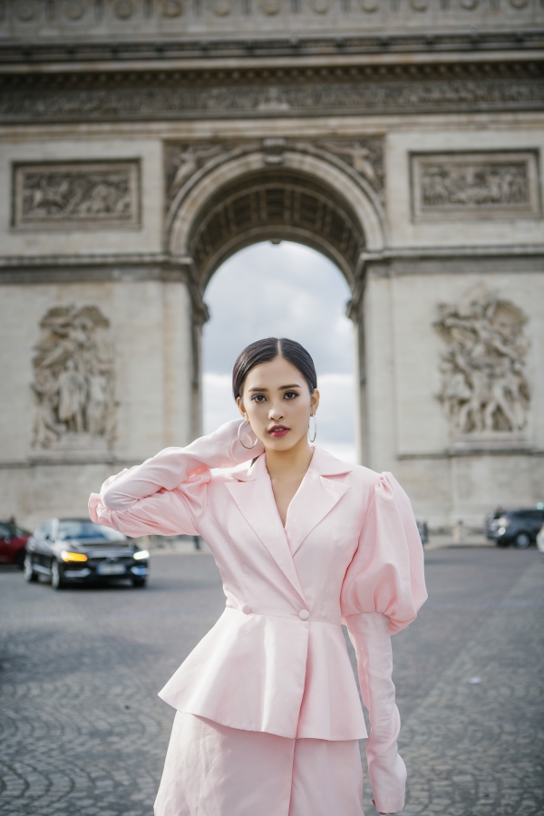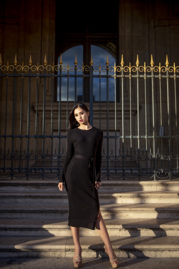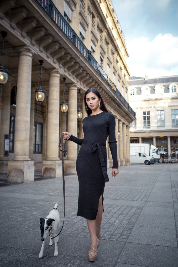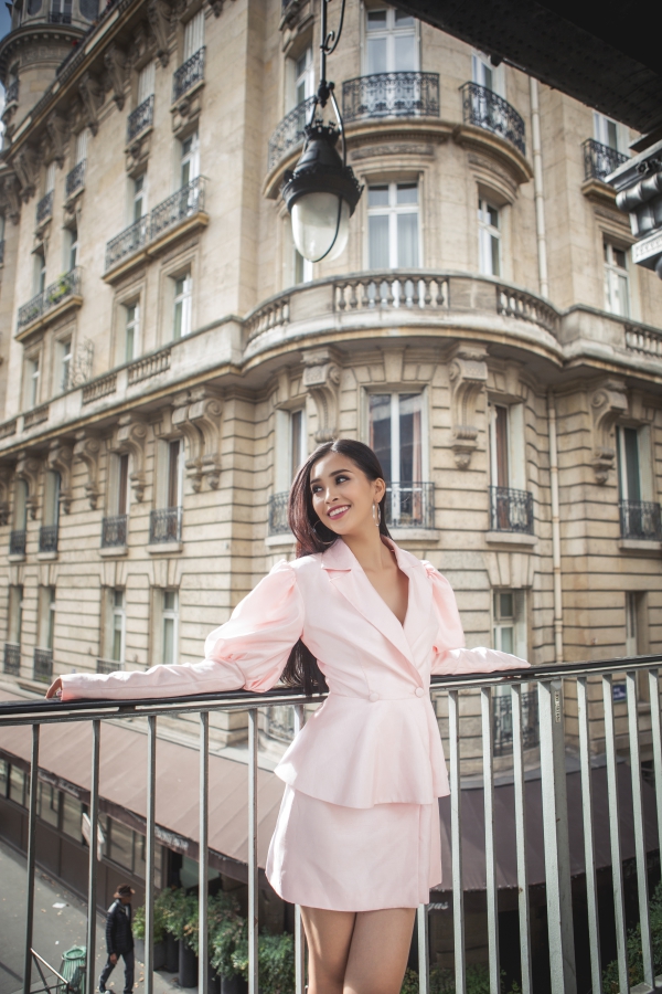 Hoa hậu Việt Nam 2018 khoe nhan sắc trên đường phố Paris. Cô có gương mặt khả ái, hiện đại.