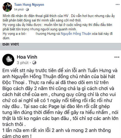 Cũng theo đó, nam ca sĩ Tuấn Hưng cũng cho biết, ngay sau khi anh viết lên trang cá nhân bày tỏ những bức xúc vì cách chế lời rất bậy của Hoa Vinh trong ca khúc “Độc thoại” thì chính Hoa Vinh đã chủ động gọi điện cho Tuấn Hưng. Hoa Vinh cũng giải thích đoạn video được anh thực hiện từ khá lâu nhưng do các trang mạng cắt ghép để gây chú ý trong thời điểm nhạy cảm.