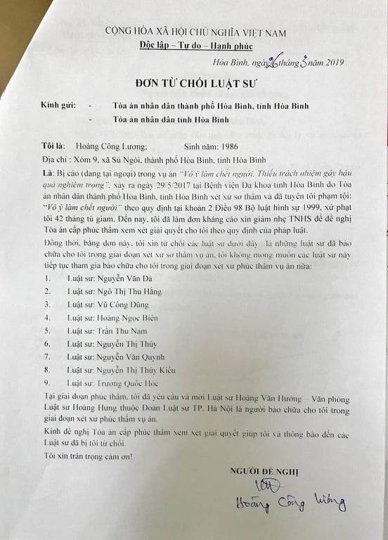 Được biết, lý do là luật sư bào chữa cho bị cáo Hoàng Công Lương (SN 1986), bác sĩ khoa Hồi sức tích cực, nay là viên chức phòng Công nghệ thông tin, BVĐK tỉnh Hòa Bình là luật sư Hoàng Văn Hướng có đơn xin hoãn phiên tòa.