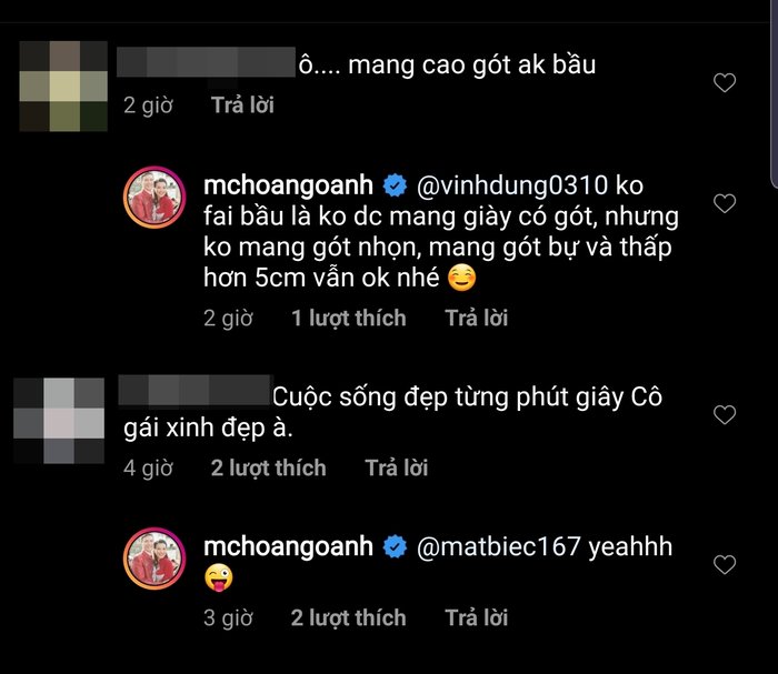 Mới đây, trên trang cá nhân của mình, á hậu Hoàng Oanh đã lên tiếng về vấn đề trang phục trong khoảng thời gian mang thai. Theo đó, cô được nhiều người khuyên nên đi giày bệt thay vì giày cao gót để đảm bảo an toàn cho mẹ và bé.
