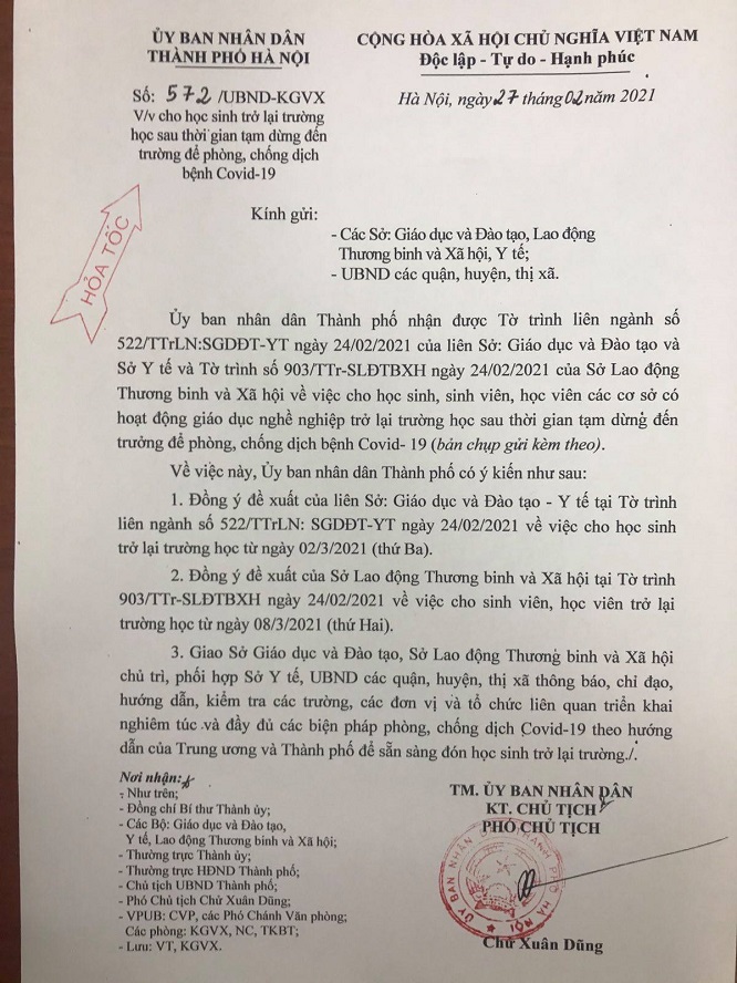Ngày 27/2, UBND thành phố Hà Nội ban hành quyết định đồng ý đề xuất của liên Sở Giáo dục và Đào tạo, Sở Y tế về việc cho học sinh trở lại trường học từ ngày 2/3/2021.