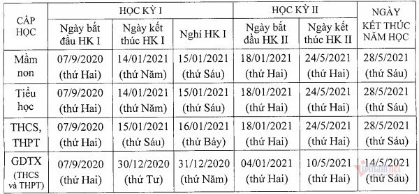 Thời gian kết thúc học kỳ I trước ngày 16/1/2021, hoàn thành kế hoạch giáo dục học kỳ II trước ngày 25/5/2021 và kết thúc năm học trước ngày 31/5/2021.