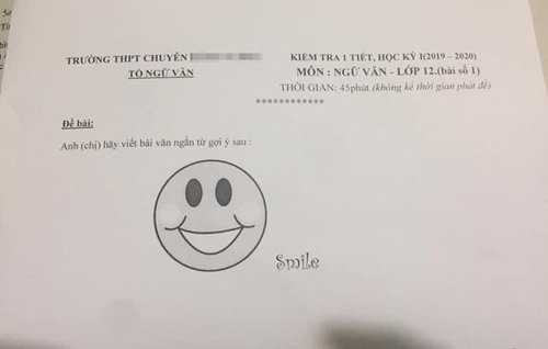 Theo đó, trong một tiết kiểm tra văn lớp 12 được chia sẻ mới đây trên mạng xã hội, nhiều người tỏ ra thích thú bởi cách ra đề của giáo viên. Đề bài có yêu cầu học sinh viết một bài văn ngắn từ gợi ý, nhưng cả tờ giấy chỉ có đúng hình mặt cười và chữ smile khá nổi bật. Dù nhận ra được đây là đề mở, nhưng các cô cậu học trò khi cầm tờ đề lên vẫn không tránh khỏi vài giây đứng hình.