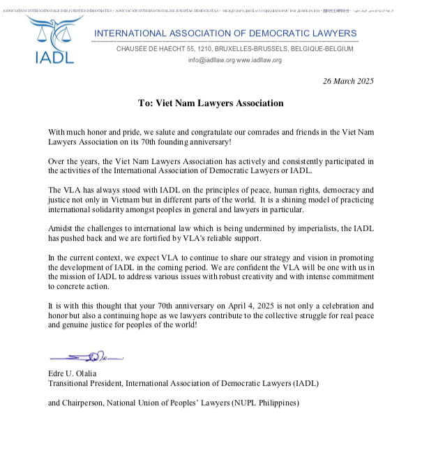 Nhân dịp kỷ niệm 70 năm ngày thành lập Hội Luật gia Việt Nam (4/4/1955 – 4/4/2025), Hội Luật gia Dân chủ Quốc tế đã gửi thư chúc mừng Hội Luật gia Việt Nam nhân kỷ niệm 70 năm ngày thành lập.