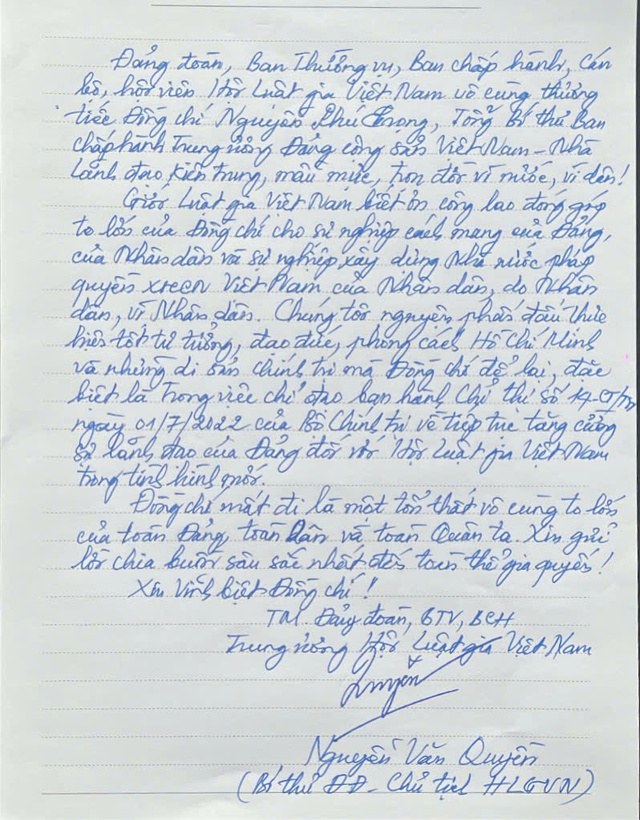 Trong sổ tang, đồng chí Nguyễn Văn Quyền - Bí thư Đảng đoàn, Chủ tịch Hội Luật gia Việt Nam,xúc động viết: "Đảng đoàn, Ban Thường vụ, Ban Chấp hành, cán bộ, Hội viên Hội Luật gia Việt Nam vô cùng thương tiếc đồng chí Nguyễn Phú Trọng, Tổng Bí thư Ban Chấp hành Trung ương Đảng Cộng sản Việt Nam – Nhà lãnh đạo kiên trung, mẫu mực, trọn đời vì nước, vì dân!