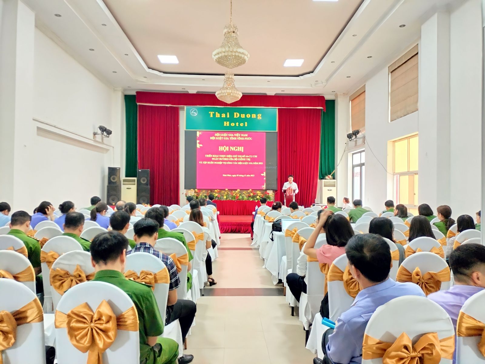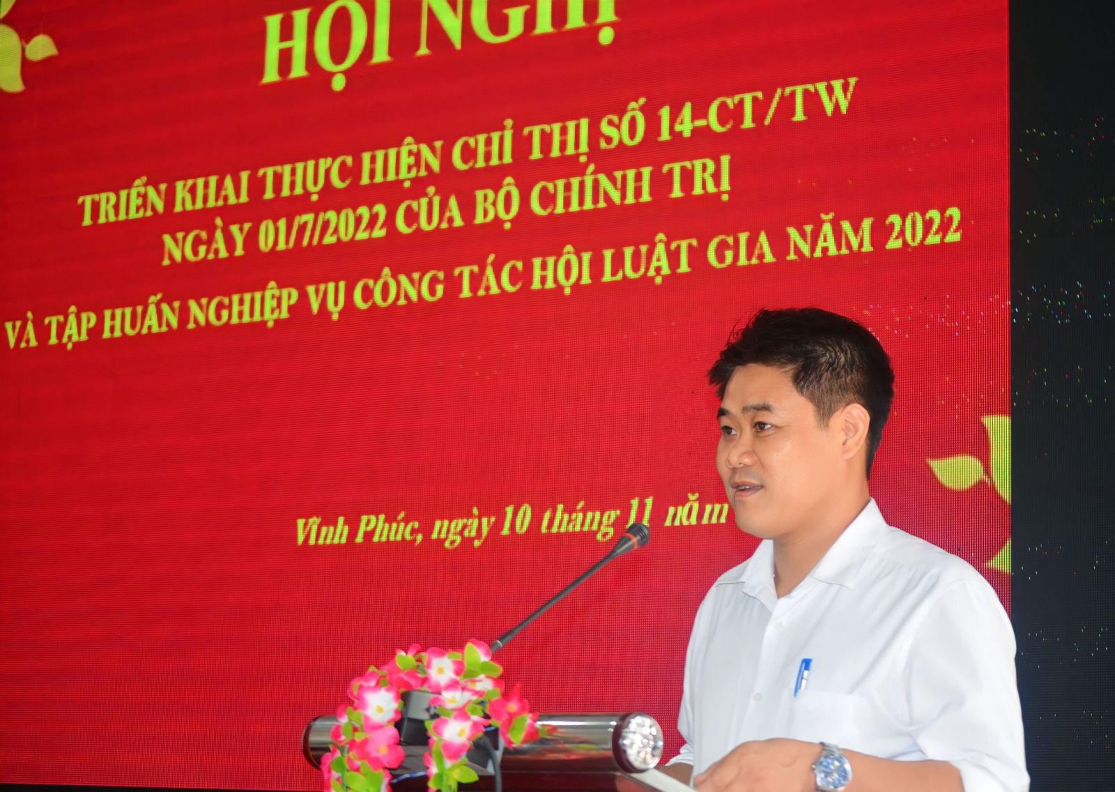 Nhằm tuyên truyền, quán triệt triển khai thực hiện Chỉ thị số 14-CT/TW ngày 01/7/2022 của Bộ Chính trị về tiếp tục tăng cường sự lãnh đạo của Đảng đối với Hội Luật gia Việt Nam trong tình hình mới; đồng thời, cập nhật kiến thức, nâng cao kỹ năng, nghiệp vụ hoạt động hội cho các hội viên Hội Luật gia trên địa bàn tỉnh. Ngày 10/11, Hội Luật gia tỉnh Vĩnh Phúc tổ chức Hội nghị triển khai thực hiện Chỉ thị số 14-CT/TW ngày 01/7/2022 của Bộ Chính trị và Tập huấn nghiệp vụ công tác Hội Luật gia năm 2022.