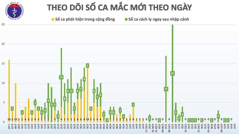 - Tính từ 6h ngày 16/4 đến 6h ngày 15/6: đã 60 ngày Việt Nam không có ca lây nhiễm trong cộng đồng.