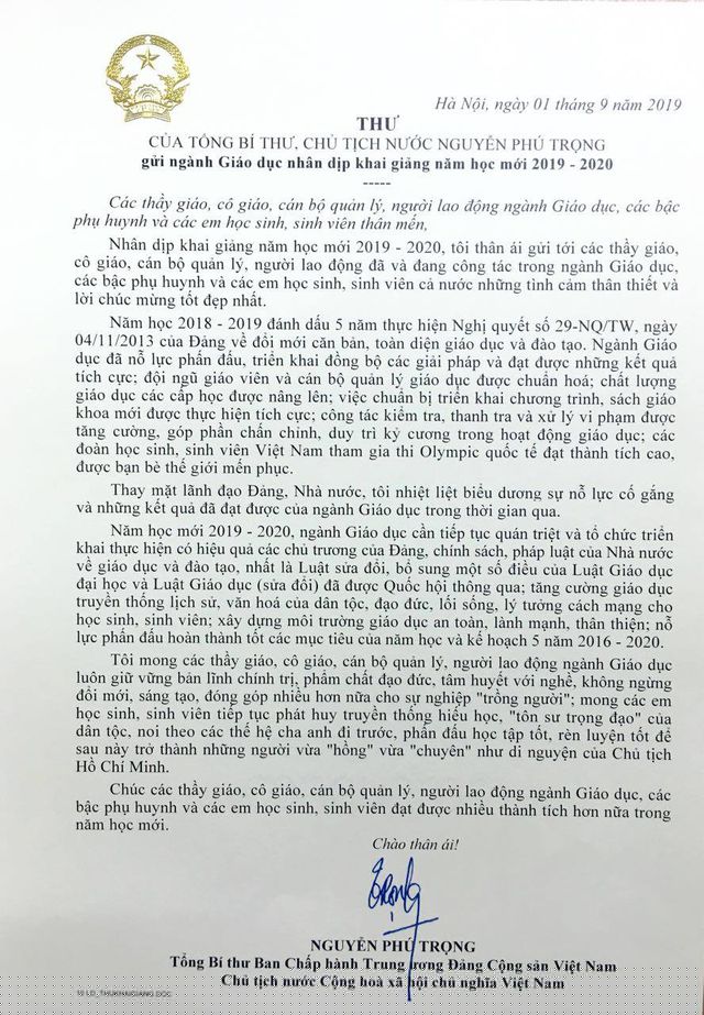 Qua thư, Tổng Bí thư, Chủ tịch nước Nguyễn Phú Trọng mong muốn năm học mới, các nhà trường tăng cường giáo dục truyền thống lịch sử, văn hóa của dân tộc, đạo đức lối sống, lý tưởng cách mạng cho học sinh, sinh viên, xây dựng môi trường giáo dục an toàn, lành mạnh, thân thiện.