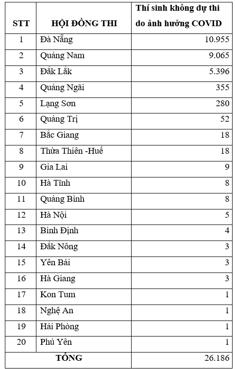 Qua báo cáo nhanh, tổng số thí sinh không đến làm thủ tục dự thi là: 32.229, chiếm tỉ lệ 3,58%; trong đó, tổng số thí sinh bị ảnh hưởng bởi dịch Covid-19 nên không thể dự thi là 26.168, chiếm tỉ lệ 2,91% so với tổng số thí sinh đăng ký dự thi.