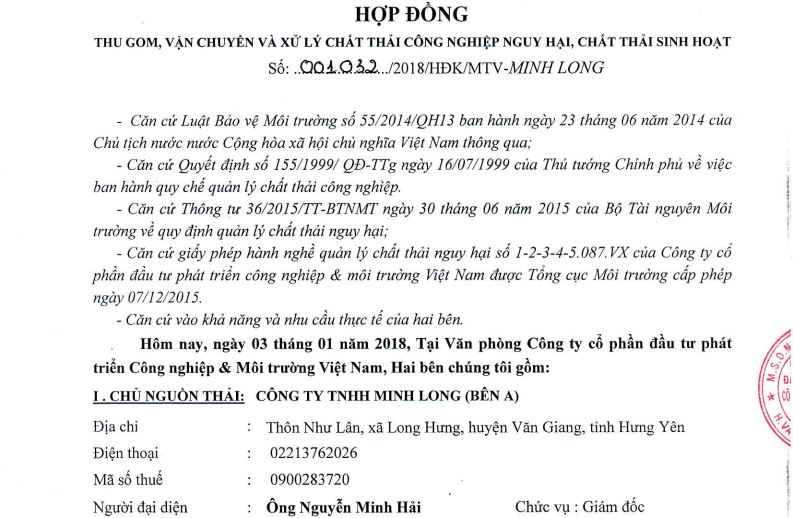 Cũng theo tìm hiểu của Pv, được biết quá trình sản xuất gỗ có tồn tại một số rác thải công nghiệp, rác thải sinh hoạt. Tuy nhiên, đối với một số chất thải công nghiệp, rác thải sinh hoạt thì công ty Minh Long ký hợp đồng thu gom xử lý rác thải với Công ty CP đầu tư phát triển công nghiệp và môi trường Việt nam. Theo hợp đồng ký kết giữa 02 công ty thì từ tháng 1/2018-12/2018 Công ty CP đầu tư phát triển công nghiệp và môi trường Việt nam có trách nhiệm thu gom chất thải công nghiệp như: găng ty, giẻ lau dính dầu, vụn ba via giấy phủ keo, vụn gỗ công nghiệp, rác thải sinh hoạt...