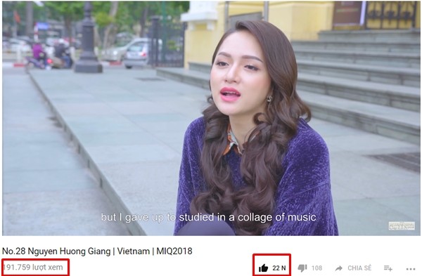 Đoạn video tự giới thiệu của Hương Giang tăng 5.000 lượt xem chỉ trong thời gian ngắn đồng thời chạm mốc 22.000 like. Như vậy, đại diện Việt Nam đã chính thức dẫn đầu trên Youtube khi thí sinh đến từ Sri Lanka vẫn dậm chân tại chỗ với 19.000 like.