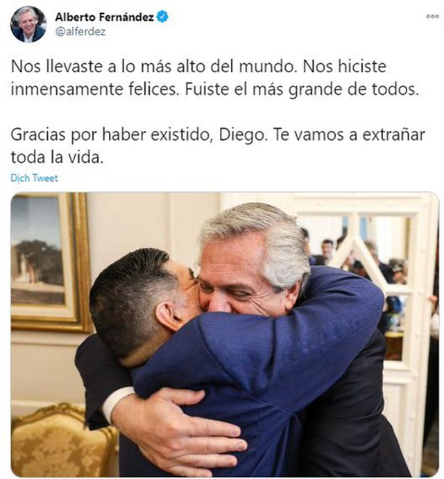 Tổng thống Argentina Alberto Fernandez cũng chia sẻ trên Twitter: "Không điều gì có thể khoả lấp được nỗi buồn sau sự ra đi của Diego. Không biết đến bao giờ chúng ta mới có thêm một con người như thế. Chúng ta biết ơn Diego vì niềm vui mà ông đã mang lại cho thế gian này".