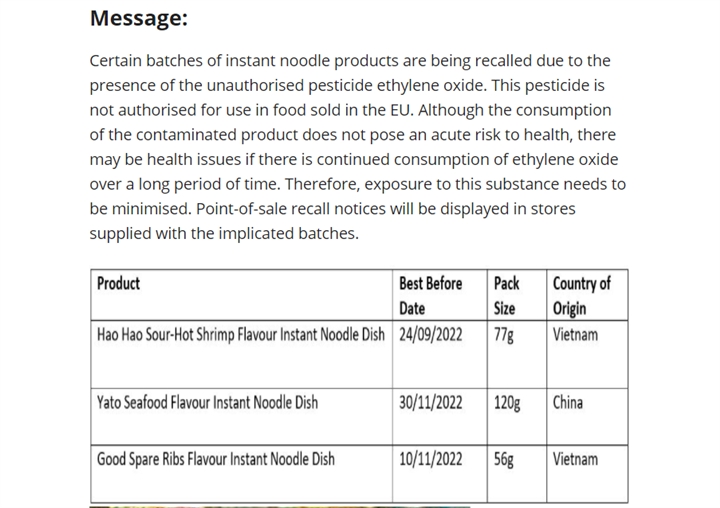 “Một số lô sản phẩm mì ăn liền đang bị thu hồi do có chứa Ethylene Oxide- thành phần thuốc trừ sâu. Thành phần này không được phép sử dụng trong thực phẩm bán tại EU", , thông báo của FSAI cho biết.