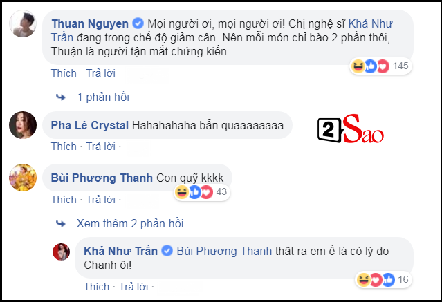 Dưới phần bình luận, đồng nghiệp thi nhau bình luận về khoảnh khắc ăn uống khôi hài của Khả Như. BB Trần than thở: "Nghệ sĩ gì mà dơ dễ sợ. Rồi tóc nó dính vào súp, nước mắm, cà ri". Thuận Nguyễn còn tung thêm hình ảnh chụp lén để chứng minh Khả Như ăn rất nhiều, thậm chí còn ăn luôn cả phần người khác.