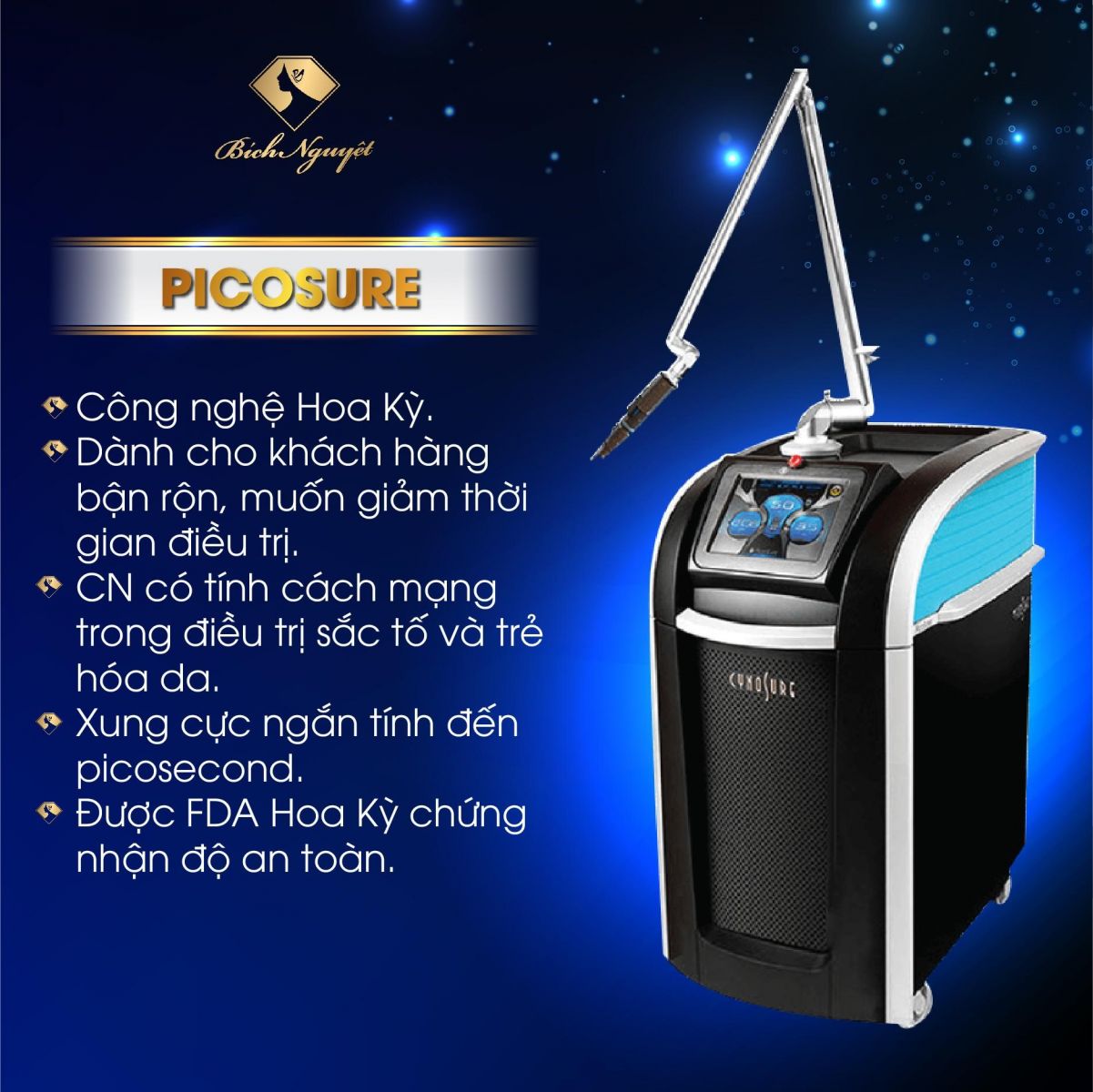 Picosure là hệ thống laser pico giây (độ rộng xung 100 lần ngắn hơn laser nano giây) đầu tiên và duy nhất trên thế giới hiện nay ứng dụng trong điều trị nám và trẻ hóa da. Hoạt động theo cơ chế tác động quang cơ hay còn gọi là sóng áp lực PressureWave đã được bảo hộ bản quyền của nhà sản xuất Cynosure Hoa Kỳ. Khi kết hợp với nhau sẽ làm vỡ chân nám thành các hạt cực nhỏ, sau đó được đào thải dễ dàng ra khỏi cơ thể.