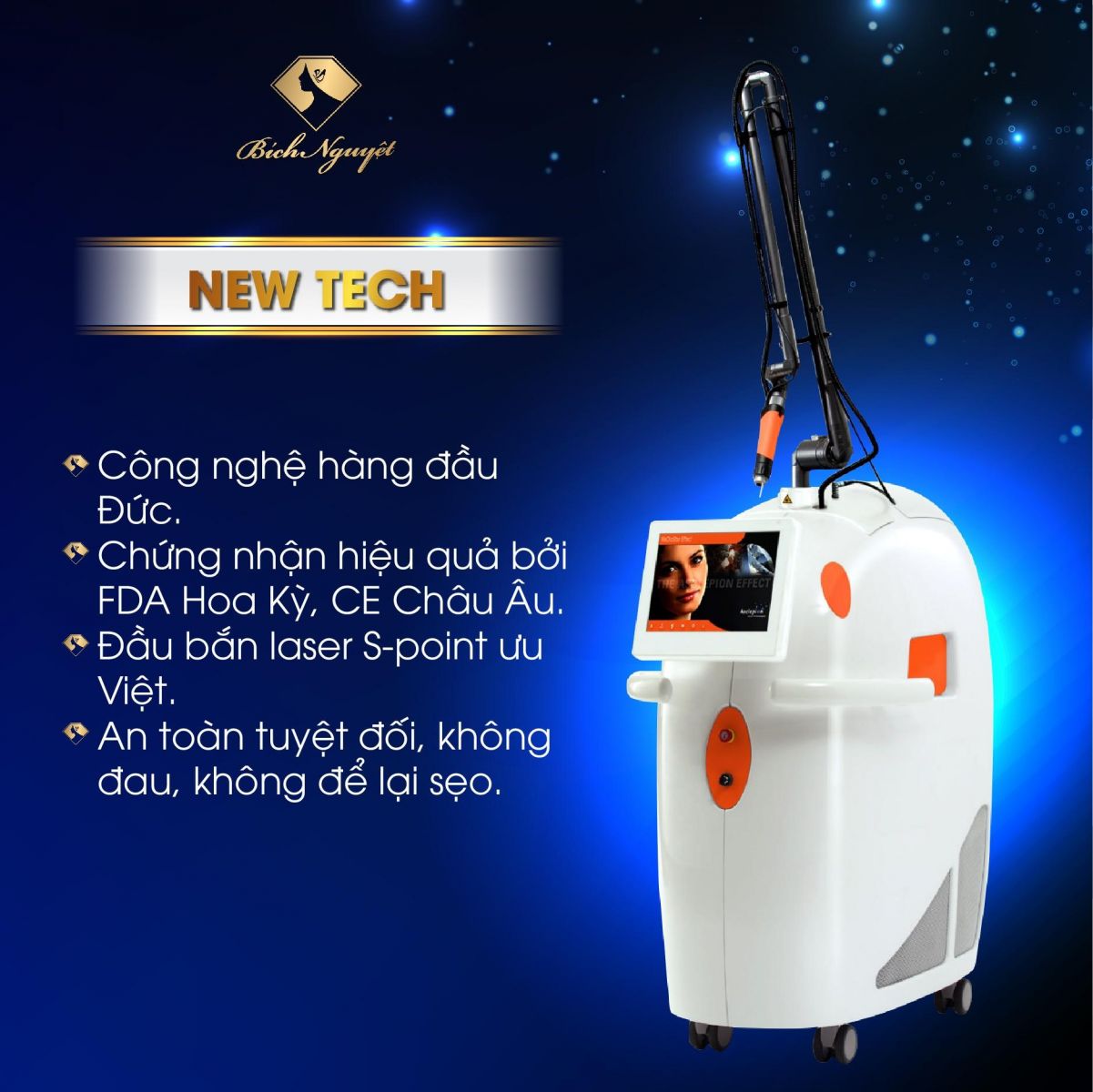 Hiện tại, Bích Nguyệt là một trong những đơn vị hiếm hoi sở hữu cả 3 công nghệ trị nám tiền tỷ. Với tổ hợp công nghệ tân tiến nhất trên thế giới, Melas Ruby tự tin tiêu diệt 6 loại nám, điều trị thành công những ca nám hỏng.
