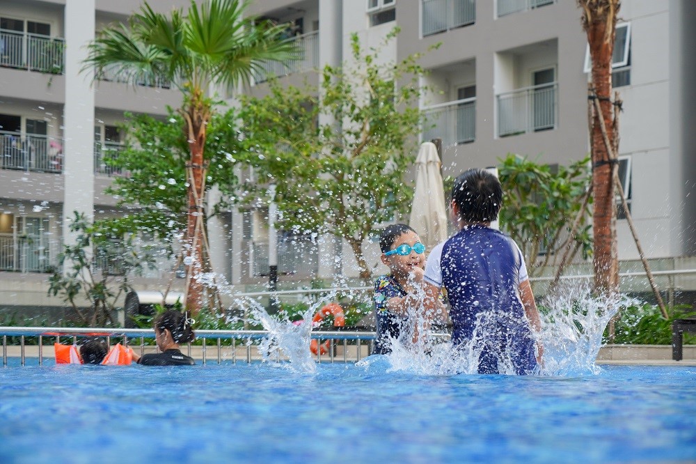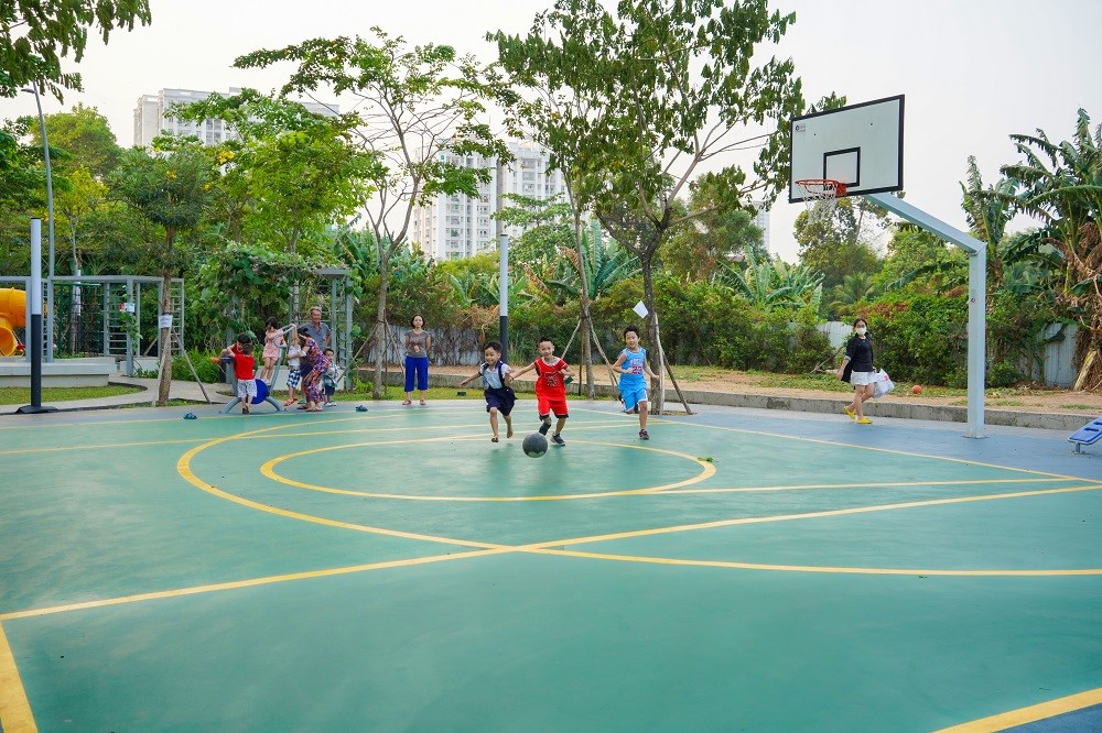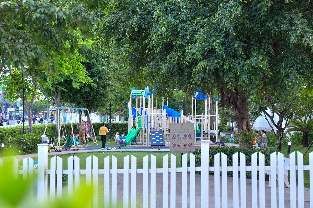 Trẻ em thoải mái vận động phát triển thể chất trong không gian rộng rãi và ngập tràn cây xanh tại dự án Lavita Charm (phường Trường Thọ).