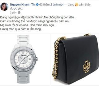 Mới đây, trên trang cá nhân Khánh Thi chia sẻ cô được mẹ chồng tặng đồng hồ Versace và túi xách Tory Burch dù không phải dịp đặc biệt nào cả.