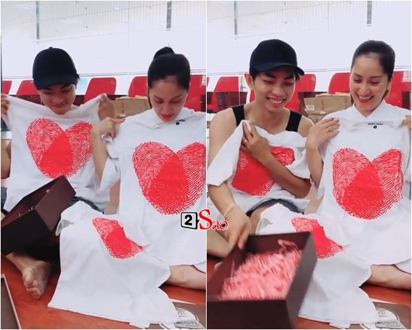 Bóc hộp quà của các học trò, Khánh Thi - Phan Hiển cười rạng rỡ như hoa. Khen 4 chiếc áo quá đẹp, cặp đôi nổi tiếng của làng khiêu vũ thể thao tiết lộ sẽ về nhà rủ rê hai nhóc tỳ của mình là Kubi và Anna đi chụp hình ngay.