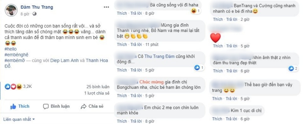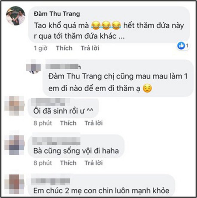 Sau khi đăng tải hình ảnh, nhiều bạn bè để lại lời chúc mừng cho nữ stylist "mẹ tròn con vuông". Tuy nhiên, bà xã Cường Đô La cũng nhận nhiều lời hối thúc sinh con cho "doanh nhân phố núi": "Bà cũng sống vội đi ", "Cô Đàm Thu Trang cũng khởi động đi", "Bạn Trang và Cường cũng nhanh nhanh có em bé đi".