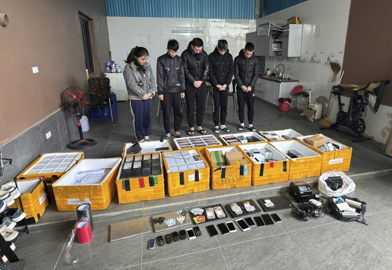 Khám xét khẩn cấp chỗ ở của các đối tượng, lực lượng Công an đã thu giữ 5 máy tính xách tay, 10 điện thoại di động cá nhân của các đối tượng sử dụng, máy in đơn; máy khò; 139 vỏ hộp điện thoại Iphone các loại và 262 hộp điện thoại Iphone nguyên kiện các loại (bên trong đựng điện thoại hỏng để chuẩn bị gửi đi); 24 thẻ ngân hàng các loại; 10 tài khoản ngân hàng phục vụ hoạt động lừa đảo chiếm đoạt tài sản, cùng các tang vật khác liên quan đến hành vi lừa đảo chiếm đoạt tài sản của nhóm đối tượng…