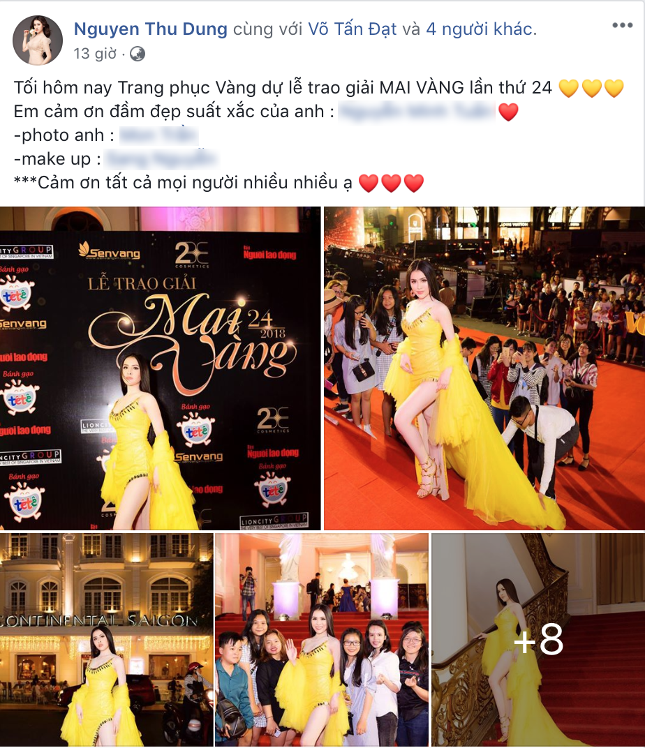 Khẳng định có vé tham dự Mai Vàng, Thư Dung hồn nhiên chia sẻ hình ảnh trên trang cá nhân. "Trang phục Vàng dự lễ trao giải Mai Vàng lần thứ 24. Em cảm ơn đầm đẹp xuất sắc. Cảm ơn tất cả mọi người", chân dài viết.