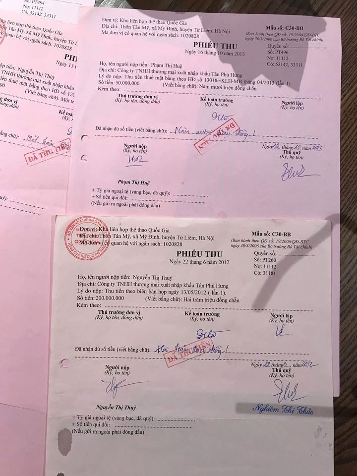 Số tiền này được coi để khắc phục hậu quả thay công ty Kinh Bắc (600 triệu đồng). Tuy nhiên, Khu LHTTQG Mỹ Đình đưa lại 2 doanh nghiệp 2 phiếu thu không số đề ngày 12/6/2012 và 22/6/2012, không xuất hoá đơn VAT. Dù nhiều lần đòi hoá đơn VAT nhưng tới nay doanh nghiệp vẫn chưa được trả.