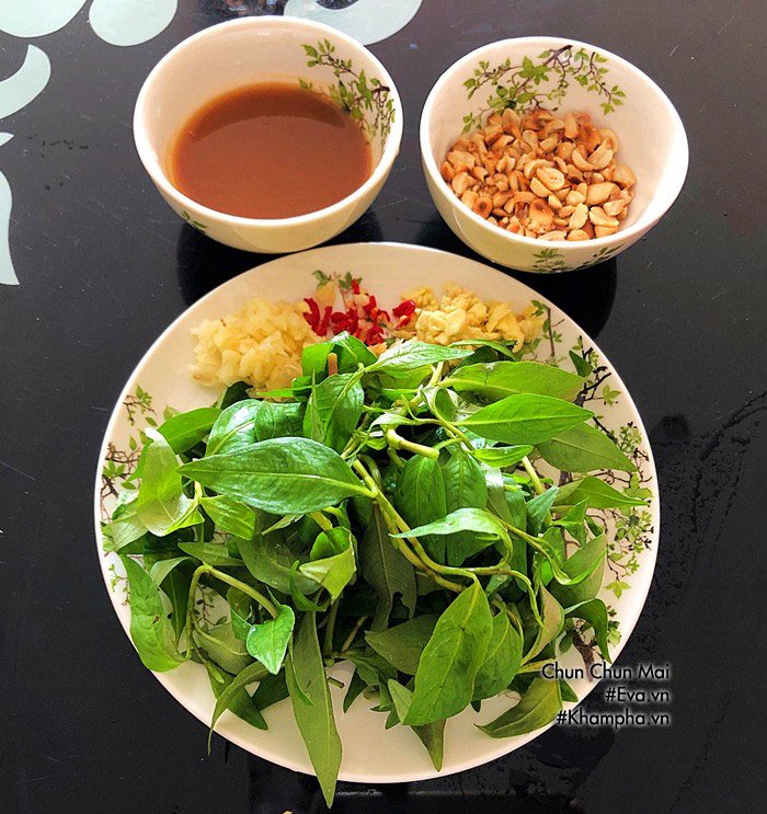 Me ngâm với 1/2 bát nước ấm cho mềm, sau đó qua rây chà lấy phần nước cốt. Đậu phộng rang chín, bóc vỏ, giã giập. Tỏi bóc vỏ, rửa sạch, đập giập, băm nhỏ. Ớt bỏ cuống, rửa sạch, xắt lát. Gừng cạo vỏ, rửa sạch, đập giập, băm nhỏ. Rau răm nhặt bỏ gốc, cọng già, lá giập úa, rửa sạch, xắt nhỏ.